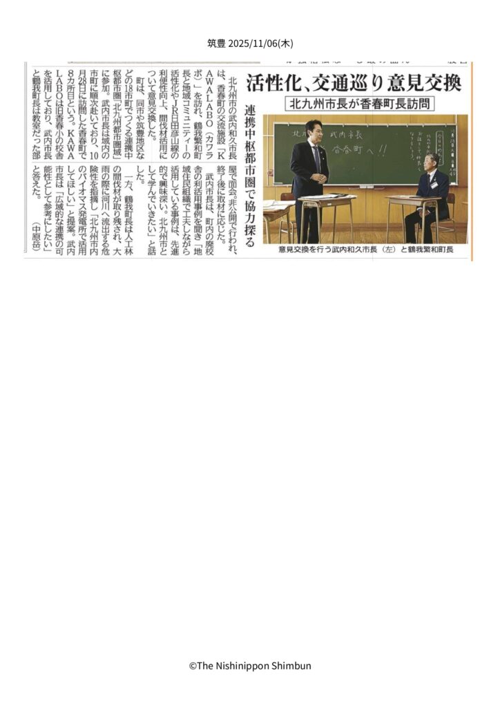 北九州市武内市長と香春町鶴我町長の意見交換会開催 2025年11月7日 最終更新日時 : 2025年11月7日 cjadmin 令和7年10月28日 KAWALABOにて北九州市武内市長と香春町鶴我町長との意見交換会が実施されました。今後の北九州市と香春町の連携について協議が行われました。
